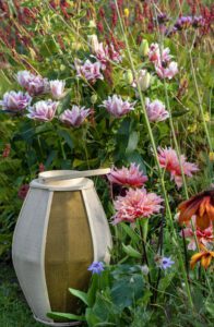 The colours are mainly pastels interspersed with a few bright accents. The shapes are often nostalgic and traditional, such as old dishes, bowls or jugs. Garden furniture also often has a vintage look.