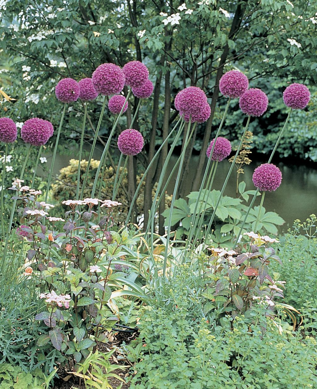 Its name – giganteum – is a good indication that this is one of the tallest of the allium species. Its leaves are striped blue-grey; unfortunately these are already withering back when the plant blooms. The ball-shaped inflorescence consists of more than 100 flowers and has a diameter of at least 20 cm. Placing small groups of 3 to 5 bulbs in a low-growing planting creates a very handsome effect.