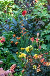 - Crocosmia (Montbretia) is also a great choice for partial shade. Its fiery red, orange or yellow flowers attract butterflies and add vibrant colour among other plants such as ferns or hostas.