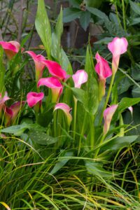 - Calla lilies (Zantedeschia) also do well in the shade. Their elegant, calyx-shaped flowers and glossy leaves bring a modern look to the garden or balcony. Plant them in a large pot or combine them with perennials for an interesting contrast.